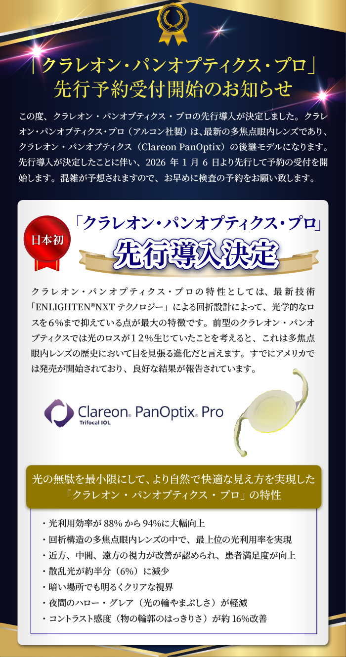 2022年度の多焦点眼内レンズ「パンオプティクスおよびクラレオンパンオプティクス」の執刀実績において医師個人として日本一を記録。(ALCON社公式認定)