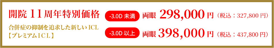 ICL手術は、近視用のレンズで60万円、乱視用のレンズで70万円が一般な相場になっています。冨田実アイクリニック銀座では、多くの方に視力回復手術を受けてもらえるように手術費用を抑える努力を継続して、328,000円からICL手術を提供しています。